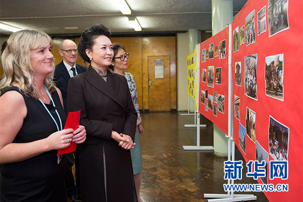 在英國(guó)教育部國(guó)務(wù)大臣吉布、學(xué)校校長(zhǎng)等陪同下,彭麗媛觀看學(xué)生們用中文進(jìn)行的才藝表演,參觀學(xué)校成果展,觀摩中文課,與女學(xué)生們互動(dòng)交流,并向?qū)W校贈(zèng)送中國(guó)文化及漢語(yǔ)學(xué)習(xí)類圖書(shū)及音像制品。