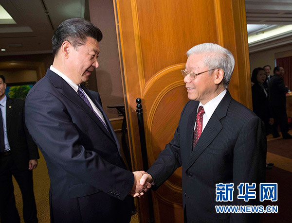 11月6日,中共中央總書記、國家主席習(xí)近平在河內(nèi)再次會(huì)見越共中央總書記阮富仲。 新華社記者蘭紅光攝