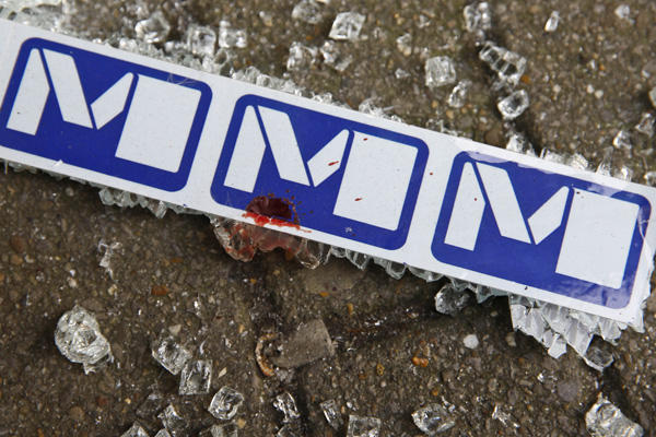 圖為3月22日在比利時(shí)首都布魯塞爾馬埃勒貝克地鐵站一個(gè)出口處拍攝的沾有血滴的地鐵標(biāo)志。新華社記者葉平凡攝