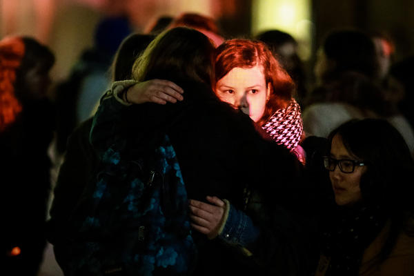 3月22日,在比利時(shí)首都布魯塞爾,兩名現(xiàn)場(chǎng)目擊者在接受采訪時(shí)潸然淚下。新華社記者龔兵攝