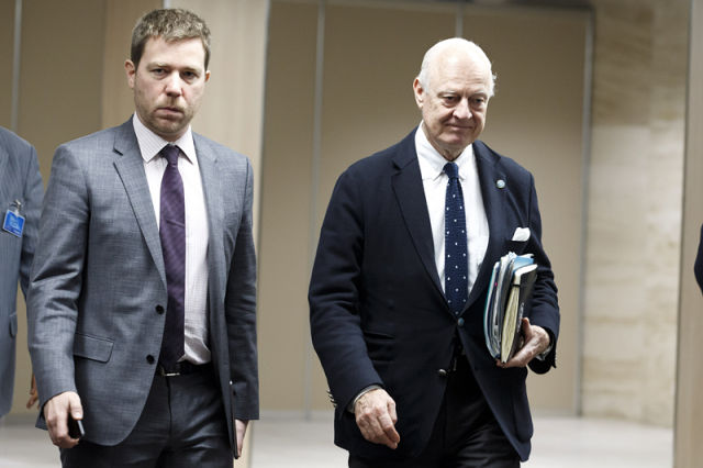 3月18日,在瑞士日內(nèi)瓦聯(lián)合國(guó)歐洲總部,聯(lián)合國(guó)敘利亞問(wèn)題特使德米斯圖拉(右)準(zhǔn)備參加敘利亞問(wèn)題新一輪和談。 新華社/美聯(lián)