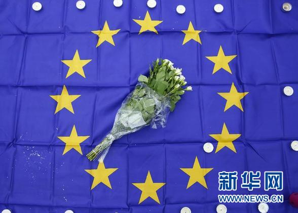 3月23日,在比利時首都布魯塞爾市中心的股票交易所前,一束鮮花和蠟燭擺放在歐盟旗幟上。當(dāng)日,數(shù)千民眾自發(fā)聚集在股票交易所前,為恐怖襲擊遇難者集體默哀。 新華社記者 葉平凡 攝