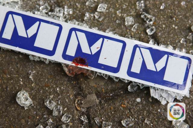 這是3月22日在比利時首都布魯塞爾馬埃勒貝克地鐵站一個出口處拍攝的沾有血滴的地鐵標志。 新華社記者葉平凡攝