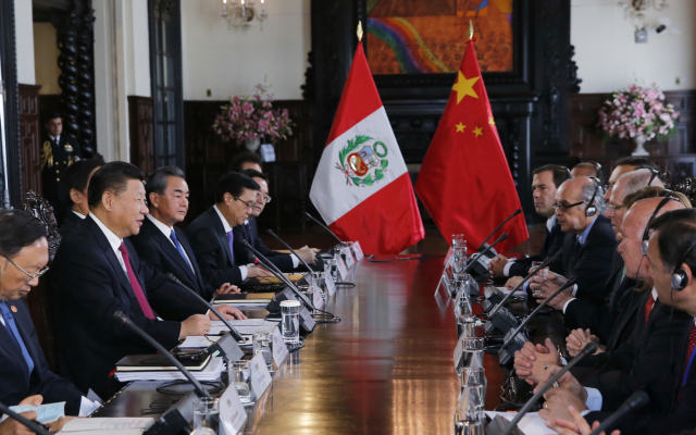 11月21日,國家主席習近平在利馬同秘魯總統(tǒng)庫琴斯基舉行會談。(新華社記者 鞠鵬 攝)