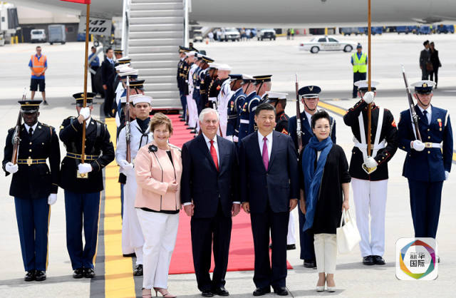 4月6日,國家主席習近平乘專機抵達美國佛羅里達州,將在海湖莊園同美國總統特朗普舉行中美元首會晤。習近平和夫人彭麗媛受到美國國務卿蒂勒森夫婦等熱情迎接。(新華社記者吳曉凌攝)