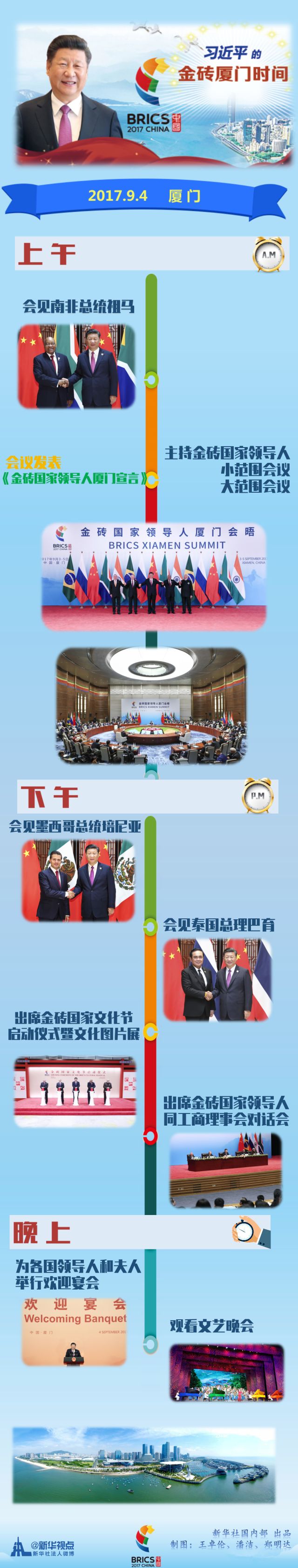 廈門,顧名思義是“大廈之門”。我衷心希望廈門會晤為我們開啟新的合作之門、發展之門,迎來金磚合作第二個“金色十年”,開辟新興市場國家和發展中國家光明未來。