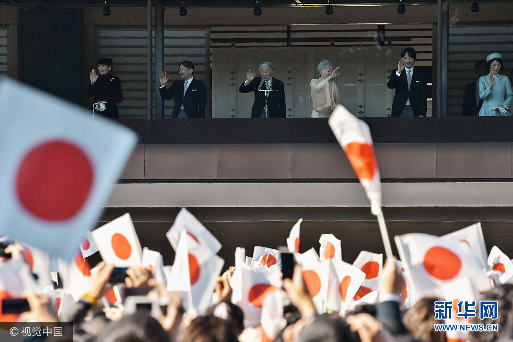 當(dāng)?shù)貢r(shí)間2017年12月23日,日本東京,日本明仁天皇慶祝84歲生日,在皇宮的陽(yáng)臺(tái)上向祝福者揮手致意。(圖片來(lái)源:視覺(jué)中國(guó))