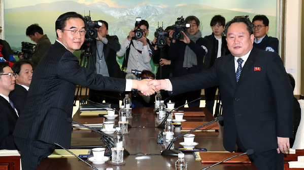 當(dāng)?shù)貢r(shí)間9日10時(shí)(北京時(shí)間9時(shí)),韓國和朝鮮代表在板門店韓方一側(cè)“和平之家”開始舉行高級別會談,討論朝方派代表團(tuán)參加平昌冬奧會、南北關(guān)系改善等議題。這是2015年12月韓朝副部長級會談之后雙方首次舉行政府間會談。