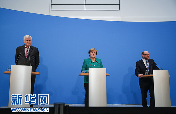 2月7日,在德國柏林的基民盟總部,德國總理、聯盟黨領導人默克爾(中),社會民主黨主席舒爾茨(右)和基社盟主席澤霍費爾出席新聞發布會。新華社記者 單宇琦 攝