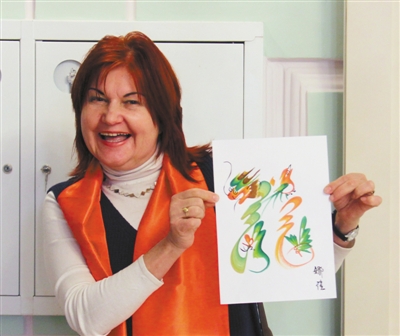 2月14日,莫斯科中國文化中心在中共六大會址常設展覽館舉辦了2018年新春聯誼會。圖為一位嘉賓展示中國民間藝人創作的龍形字畫。記者 張曉東攝