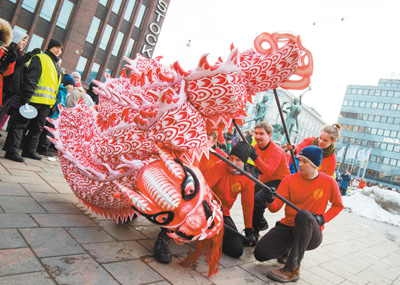 2月15日,第十二屆“歡樂春節·赫爾辛基廟會”在芬蘭首都赫爾辛基舉行,吸引大量民眾參加。圖為當地人在舞龍。新華社發