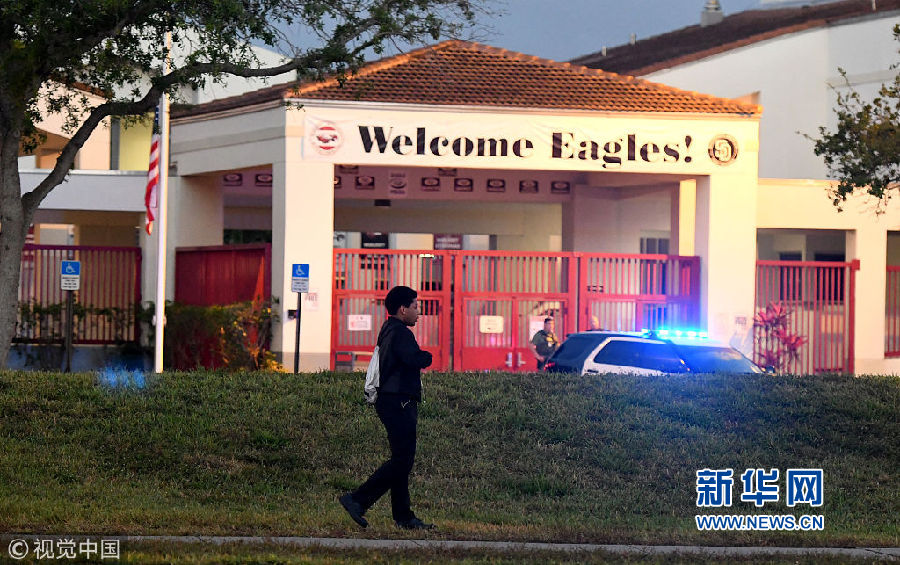 當地時間2月28日,美國佛羅里達州帕克蘭,發生槍擊案的道格拉斯中學復課,學生和教職工重返校園,大批警察出動維護治安。2月14日,一名19歲的槍手在學校里開槍,造成17人死亡。(圖片來源:視覺中國)