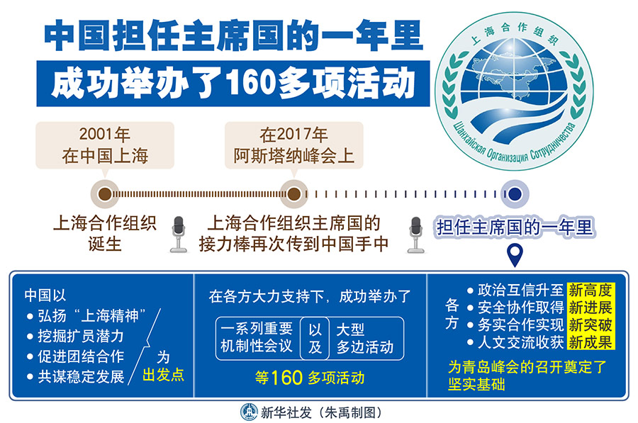 王毅指出,17年前,上海合作組織誕生于中國(guó)。在去年阿斯塔納峰會(huì)上,上海合作組織主席國(guó)的接力棒再次傳到中國(guó)手中。擔(dān)任主席國(guó)的一年里,我們以弘揚(yáng)“上海精神”、挖掘擴(kuò)員潛力、促進(jìn)團(tuán)結(jié)合作、共謀穩(wěn)定發(fā)展為出發(fā)點(diǎn),在各方大力支持下,成功舉辦了一系列重要機(jī)制性會(huì)議以及大型多邊活動(dòng)等160多項(xiàng)活動(dòng)。各方政治互信升至新高度,安全協(xié)作取得新進(jìn)展,務(wù)實(shí)合作實(shí)現(xiàn)新突破,人文交流收獲新成果,為青島峰會(huì)的召開(kāi)奠定了堅(jiān)實(shí)基礎(chǔ)。