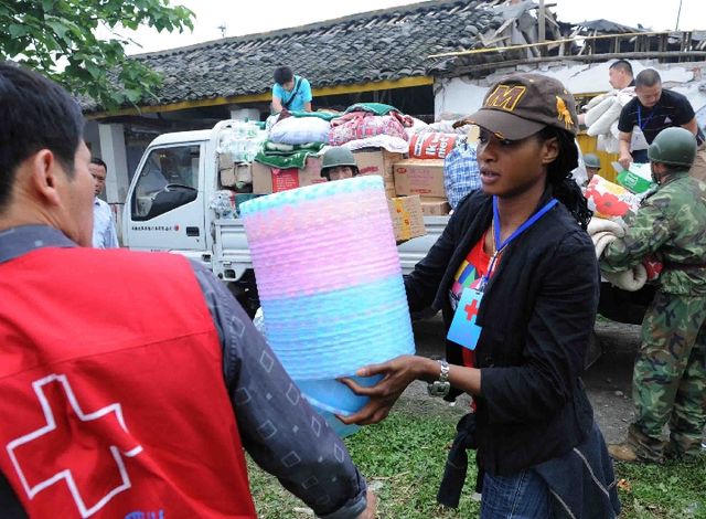 2008年5月17日,在“5·12”汶川特大地震重災(zāi)區(qū)四川省什邡市湔氐鎮(zhèn)白虎頭村,來自非洲的志愿者瑪利亞在搬運救援物資。 新華社記者劉海峰攝