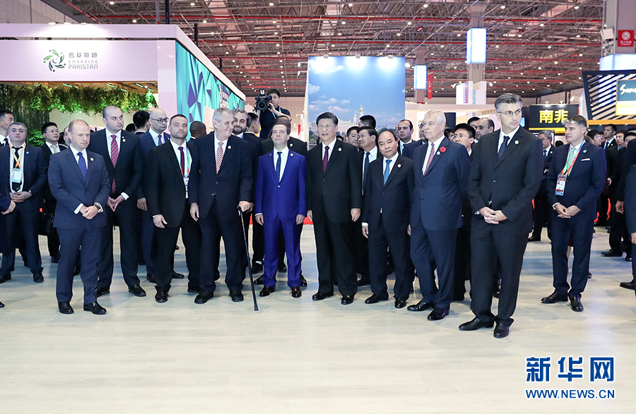 中午,習近平同外國領導人一同步入國家貿易投資綜合展展廳。他們邊走邊看,邊看邊談,先后參觀了匈牙利、埃及、英國、捷克、肯尼亞、薩爾瓦多、多米尼加、老撾、格魯吉亞、越南、巴基斯坦、俄羅斯等國展區,了解各國經貿發展成就和特色優勢產品。習近平和各國領導人通過視頻欣賞了匈牙利的美麗風光、領略了埃及的悠久文明和現代發展規劃,共同體驗了英國館炫酷時尚的裸眼3D視頻。在捷克館,澤曼總統用捷克產鋼琴即興演奏一曲,并邀請習近平品嘗捷克啤酒??夏醽喌孽r花、薩爾瓦多的咖啡、多米尼加的水果,琳瑯滿目的各國特色產品吸引中外領導人頻頻駐足。格魯吉亞總理和越南總理親自向習近平推介本國農產品和旅游項目。老撾館的中老鐵路項目沙盤和巴基斯坦館的中巴經濟走廊展板分別展現了中老、中巴共建“一帶一路”、實現共同發展的美好愿景。在俄羅斯館,習近平在梅德韋杰夫總理陪同下聽取中俄在核電、天然氣、飛機制造、地方交往等領域合作成就介紹,共同展望中俄合作的廣闊前景。