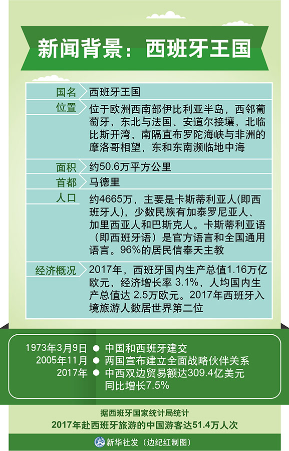 近年來,中西經(jīng)貿(mào)合作持續(xù)發(fā)展。西班牙是中國在歐盟內(nèi)第六大貿(mào)易伙伴,中國是西班牙在歐盟外第一大貿(mào)易伙伴。2017年,雙邊貿(mào)易額達(dá)309.4億美元,同比增長7.5%。據(jù)西班牙國家統(tǒng)計(jì)局統(tǒng)計(jì),2017年赴西班牙旅游的中國游客達(dá)51.4萬人次。