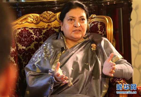 4月18日,在尼泊爾首都加德滿都總統(tǒng)府,尼泊爾總統(tǒng)比迪亞·德維·班達(dá)里接受中國媒體記者聯(lián)合采訪。新華社發(fā)(蘇尼爾·夏爾馬 攝)