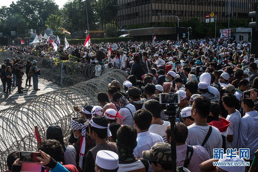 5月22日,在印度尼西亞首都雅加達,示威者聚集在選舉監督機構外。新華社發(維里 攝)