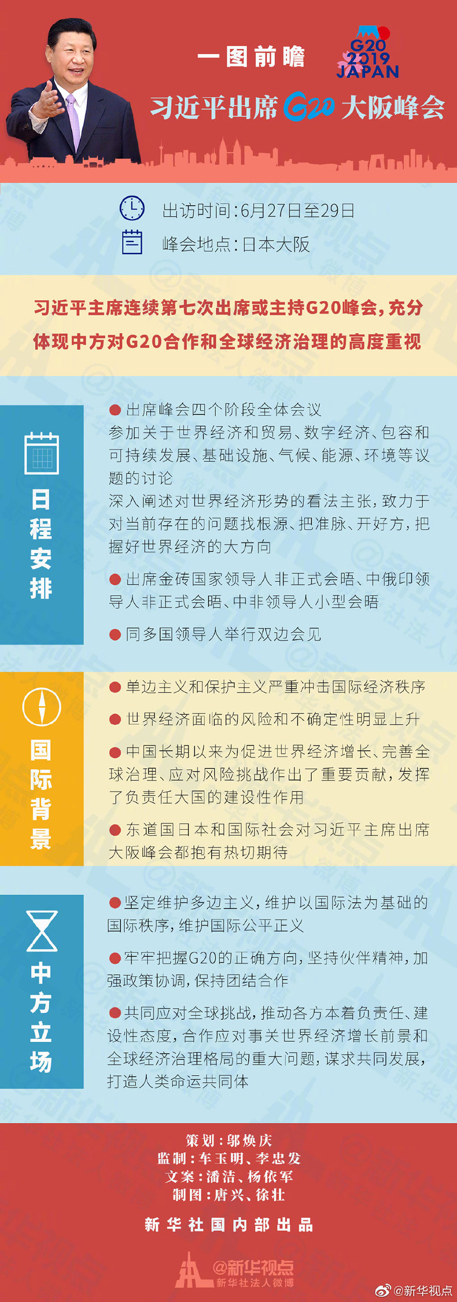 習近平主席將在G20大阪峰會上深入闡述對世界經濟形勢的看法主張,中方將與各方一道,堅定維護多邊主義,合作應對事關世界經濟增長前景和全球經濟治理格局的重大問題,謀求共同發展,打造人類命運共同體。在當前風云激蕩的國際形勢下,國際社會期待傾聽“中國聲音”。