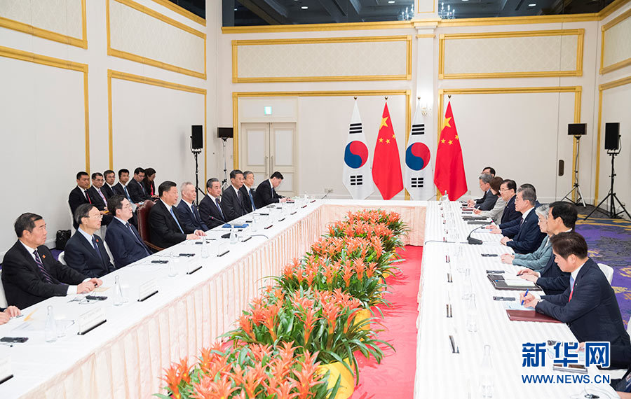 6月27日,國家主席習近平在日本大阪會見韓國總統文在寅。 新華社記者 黃敬文 攝