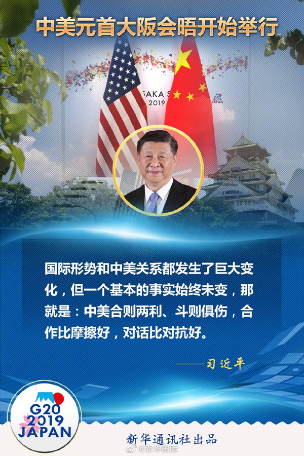 習(xí)近平在會(huì)晤開始時(shí)說(shuō),很高興同總統(tǒng)先生在大阪見面。48年前,也就是1971年,就在離這里100多公里的名古屋,參加第三十一屆世界乒乓球錦標(biāo)賽的中美乒乓球運(yùn)動(dòng)員進(jìn)行了友好互動(dòng),這就是后來(lái)人們說(shuō)的“乒乓外交”的開啟,創(chuàng)造了“小球轉(zhuǎn)動(dòng)大球”的歷史佳話。8年之后的1979年,中美建立了外交關(guān)系。回顧建交以來(lái)的40年,國(guó)際形勢(shì)和中美關(guān)系都發(fā)生了巨大變化,但一個(gè)基本的事實(shí)始終未變,那就是:中美合則兩利、斗則俱傷,合作比摩擦好,對(duì)話比對(duì)抗好。近來(lái),我同總統(tǒng)先生通過(guò)電話和書信保持著密切聯(lián)系。今天,我愿同總統(tǒng)先生就事關(guān)中美關(guān)系發(fā)展的根本性問(wèn)題交換意見,為下階段兩國(guó)關(guān)系發(fā)展定向把舵,推進(jìn)以協(xié)調(diào)、合作、穩(wěn)定為基調(diào)的中美關(guān)系。