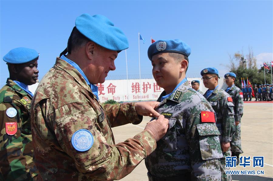4月3日,在位于黎巴嫩南部辛尼亞村的中國(guó)維和部隊(duì)營(yíng)區(qū)舉行的授勛儀式上,聯(lián)黎部隊(duì)司令德?tīng)柨茽枺ㄇ白螅楣俦砼宕鲃渍隆P氯A社發(fā)