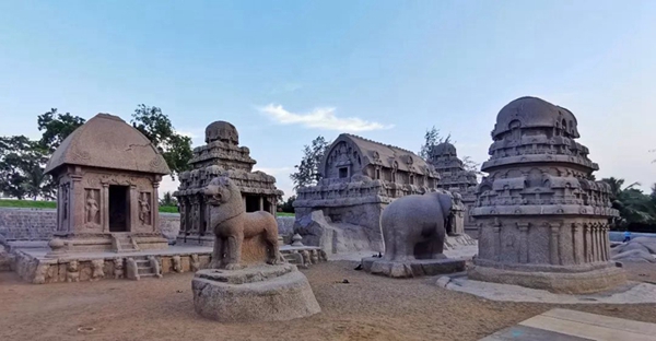 五戰(zhàn)車神廟于公元7世紀(jì)所建,均由整塊花崗巖從上至下鑿刻而成。每座建筑形態(tài)各異,分別代表印度史詩《摩訶婆羅多》中的五位王子和黑公主的座輦。1984年列入聯(lián)合國世界文化遺產(chǎn)名錄。新華社記者王曄攝