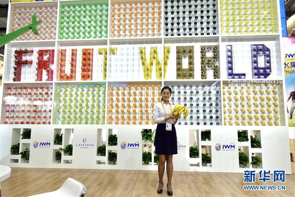 11月5日,第二屆進(jìn)博會展區(qū)的工作人員展示香蕉等各色水果。 第二屆中國國際進(jìn)口博覽會正在上海國家會展中心舉行,各展區(qū)色彩豐富的展品與設(shè)計(jì)讓人應(yīng)接不暇。 新華社記者才揚(yáng) 攝