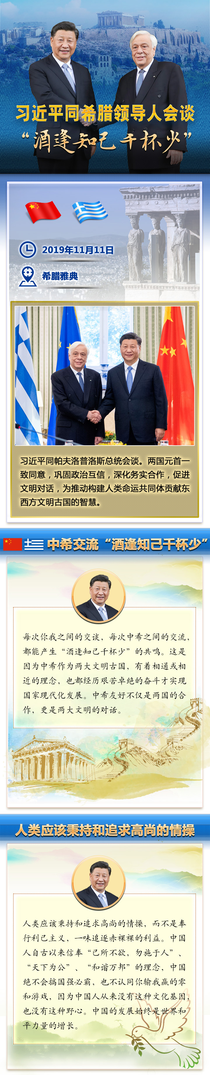 新華社雅典11月12日電 國家主席習(xí)近平11月10日晚抵達(dá)雅典,開始對希臘進(jìn)行國事訪問。11日上午,習(xí)主席的訪問活動異常密集:向希臘無名戰(zhàn)士紀(jì)念碑獻(xiàn)花圈,出席希臘總統(tǒng)帕夫洛普洛斯舉行的隆重歡迎儀式并同帕夫洛普洛斯舉行會談,旋即又同總理米佐塔基斯舉行會談、出席合作文本交換儀式、共同會見記者。中希兩國領(lǐng)導(dǎo)人就雙邊關(guān)系及共同關(guān)心的國際和地區(qū)問題深入交換意見,達(dá)成廣泛共識。