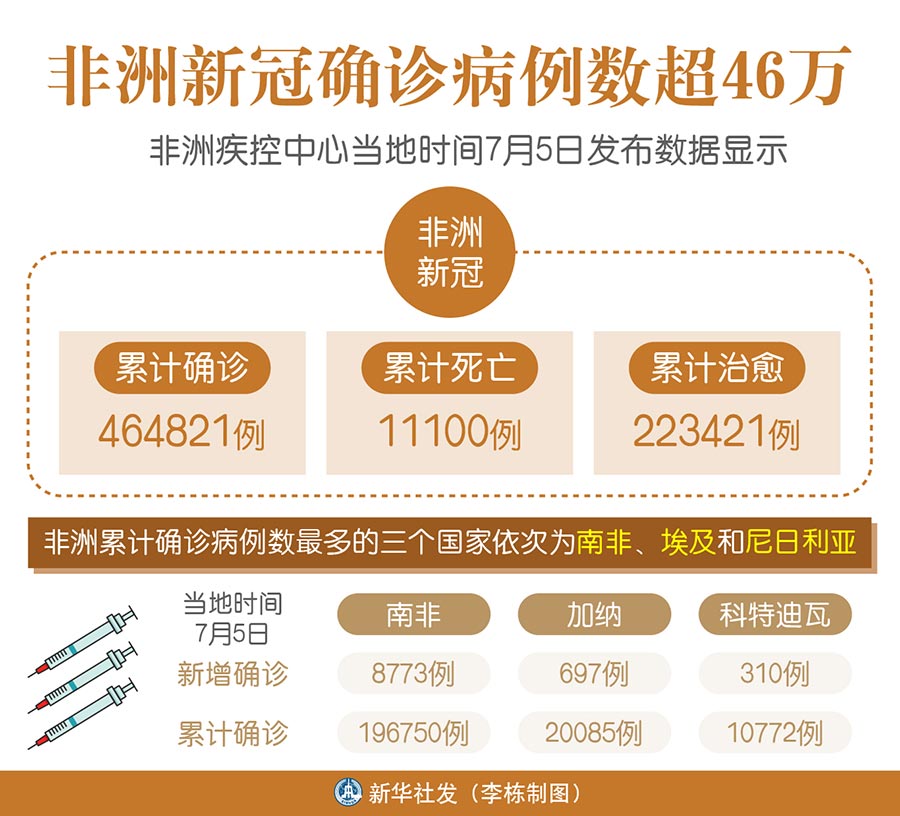 新華社阿比讓7月5日電 綜合新華社駐非洲地區記者報道:非洲疾控中心5日發布數據顯示,非洲累計新冠確診病例達464821例,累計死亡11100例,累計治愈223421例。