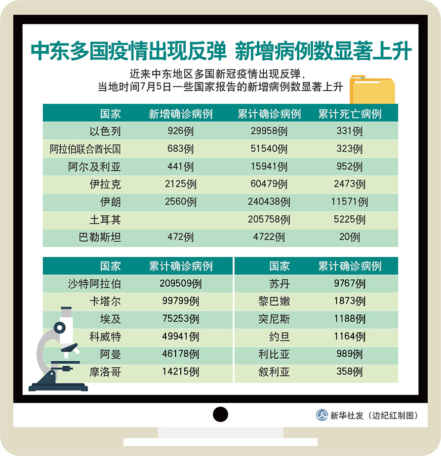 新華社喀土穆7月5日電 綜合新華社駐中東地區記者報道:近來中東地區多國新冠疫情出現反彈,一些國家5日報告的新增病例數顯著上升,多國政府敦促民眾嚴格落實防控措施。