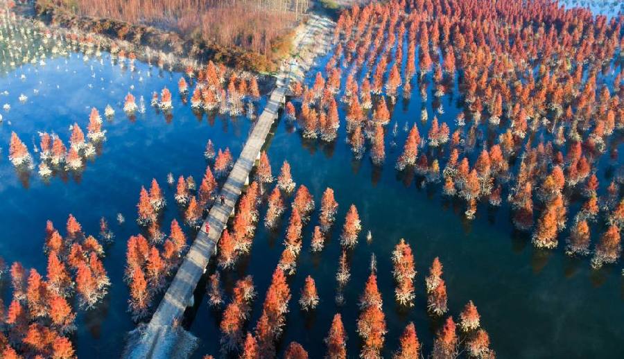 云南昆明水杉濕地冬日一景(2019年1月5日攝,無人機照片)。新華社記者 秦晴 攝