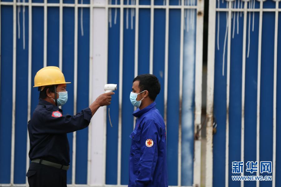 10月28日,在緬甸仰光的國家劇院維修改造項目現(xiàn)場,準(zhǔn)備上班的覺泰昂(右)接受體溫測量。新華社發(fā)(吳昂攝)