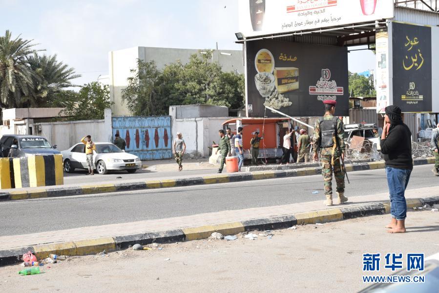 12月30日,在也門亞丁,政府軍士兵在爆炸后封鎖了亞丁國際機場的入口。新華社發(穆拉德·阿卜杜攝)