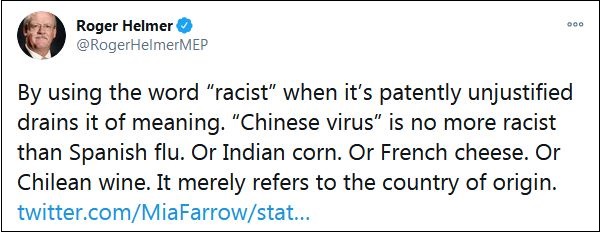大量網(wǎng)友在他的這條推特下,挖出赫爾默曾經(jīng)發(fā)表的言論。例如早在3月17日,赫爾默就在一條推特中宣稱:“在明顯不合理的情況下,使用‘種族主義’這個詞會讓它失去意義。‘中國病毒’和‘西班牙流感’一樣不是種族主義。就像印度玉米,或法國奶酪,或者智利葡萄酒。它僅僅是指原產(chǎn)國。”