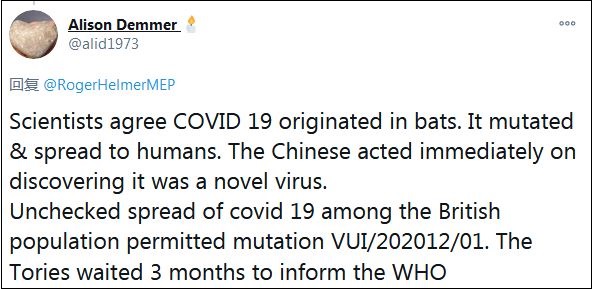 還有一名網(wǎng)友對比稱:“科學(xué)家同意新冠病毒起源自蝙蝠,變異后傳播給人類,中國人發(fā)現(xiàn)這是一種新病毒后,立即采取了行動。新冠病毒在英國人口中無限制的傳播,導(dǎo)致了變異新冠病毒(VUI/202012/01),保守黨等了3個月才通知世衛(wèi)組織。”