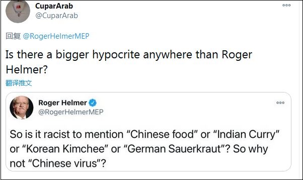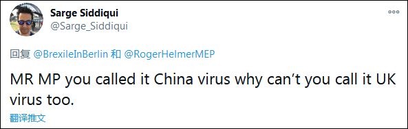 不少網(wǎng)友指出了赫爾默的雙標(biāo)。“議員先生,你管這(新冠病毒)叫‘中國病毒’,為什么不也把它叫做英國病毒?”