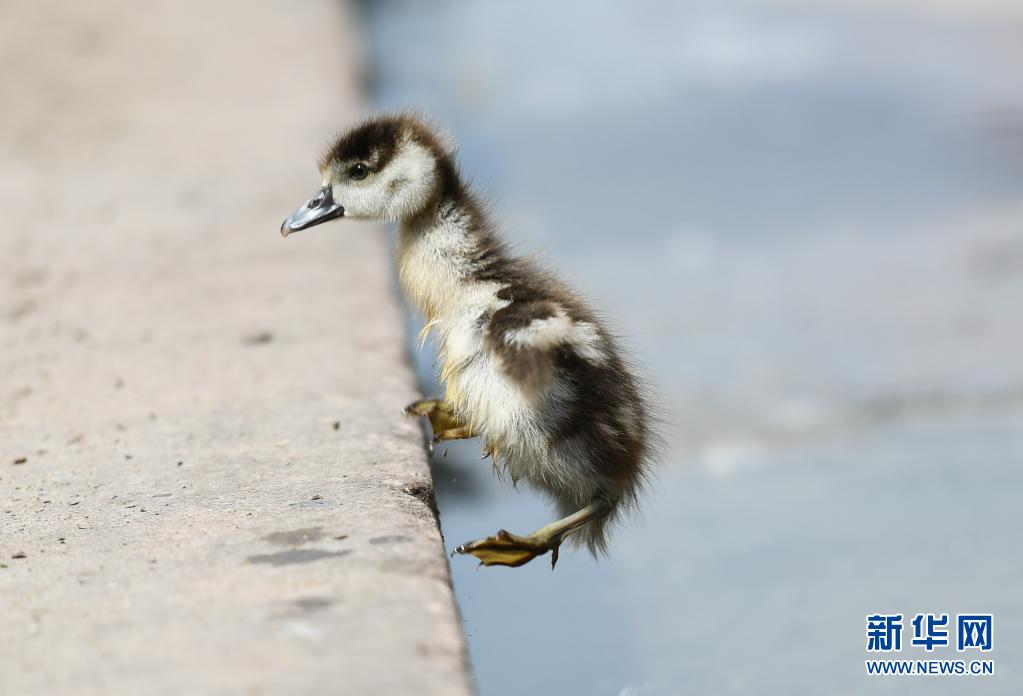 5月19日,一只埃及雁幼鳥(niǎo)在德國(guó)法蘭克福的美茵河畔覓食。
