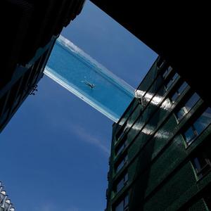 6月2日,一名男子在英國倫敦南部一個建造于兩棟公寓樓之間的“空中泳池”游泳。