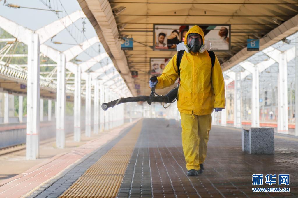 6月24日,工作人員身著防護服在俄羅斯莫斯科一個火車站進行消毒作業。