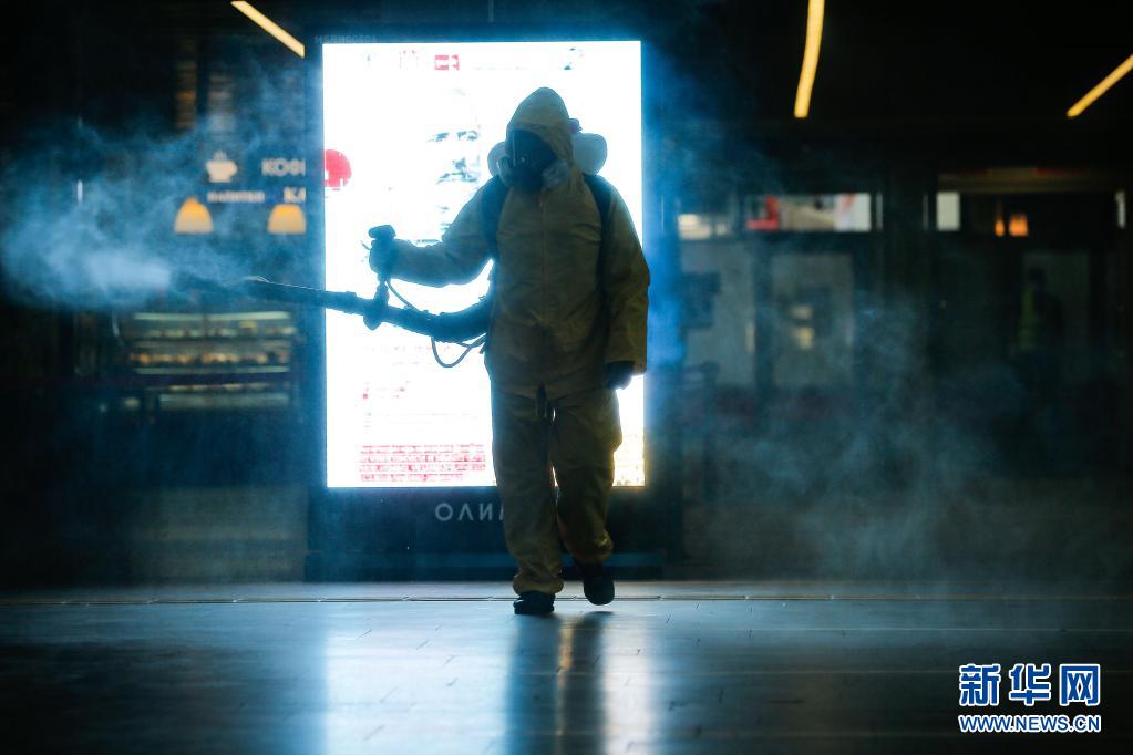 6月24日,工作人員身著防護服在俄羅斯莫斯科一個火車站進行消毒作業。
